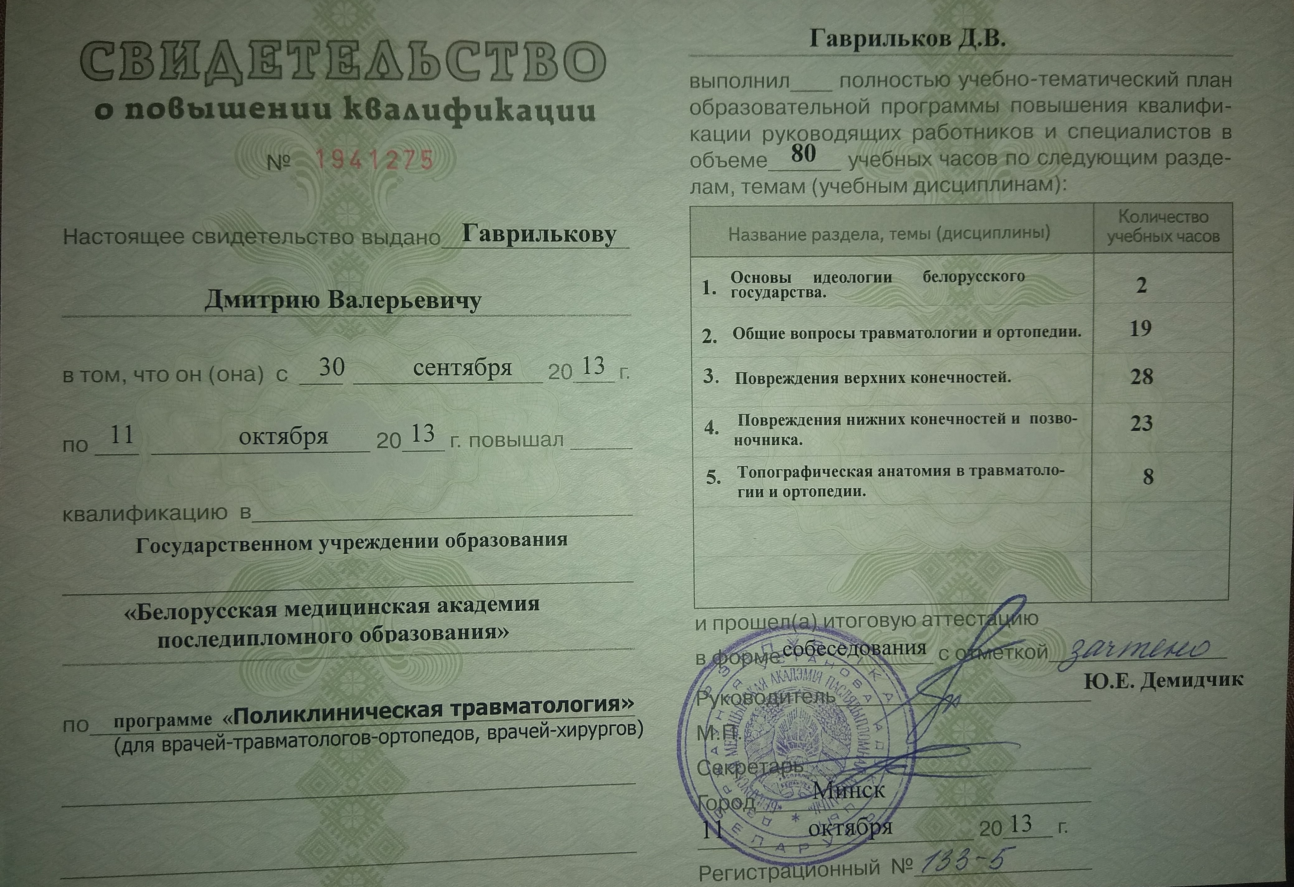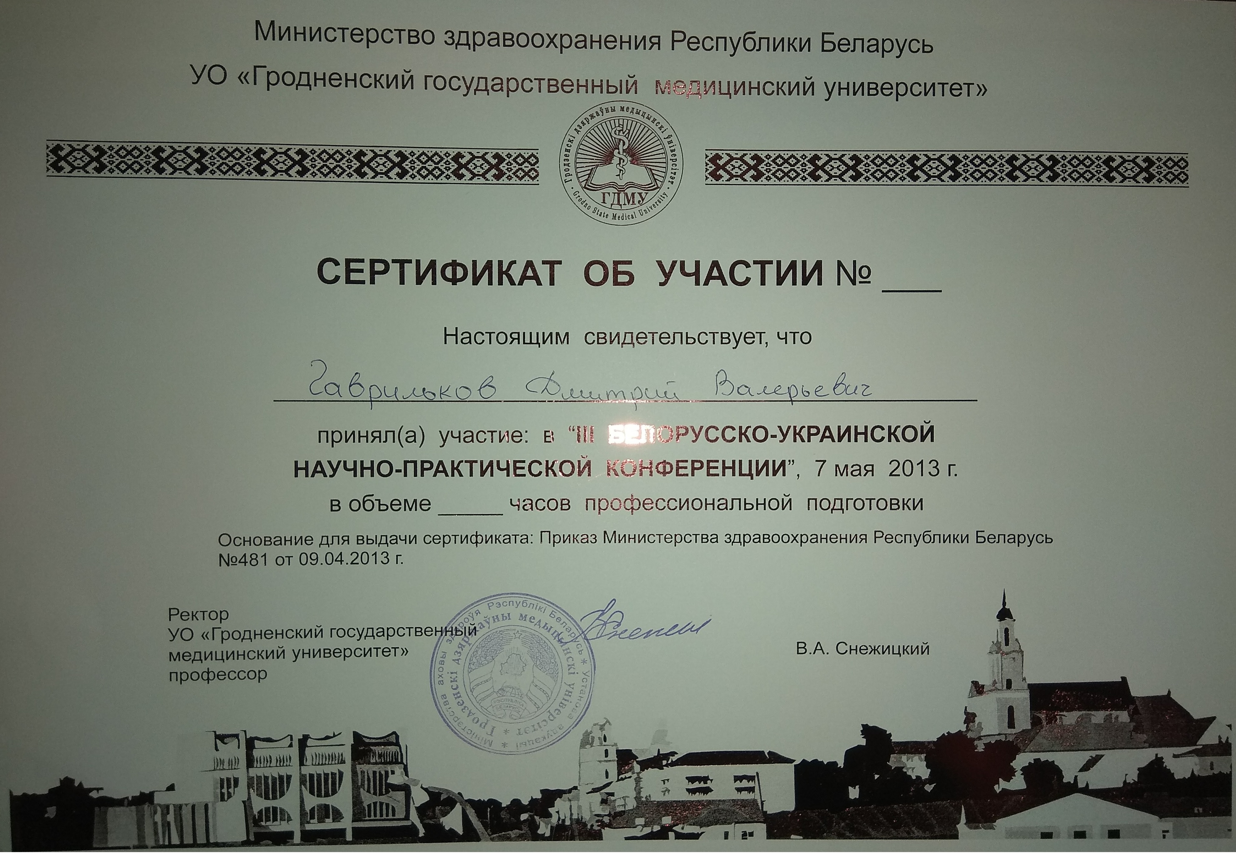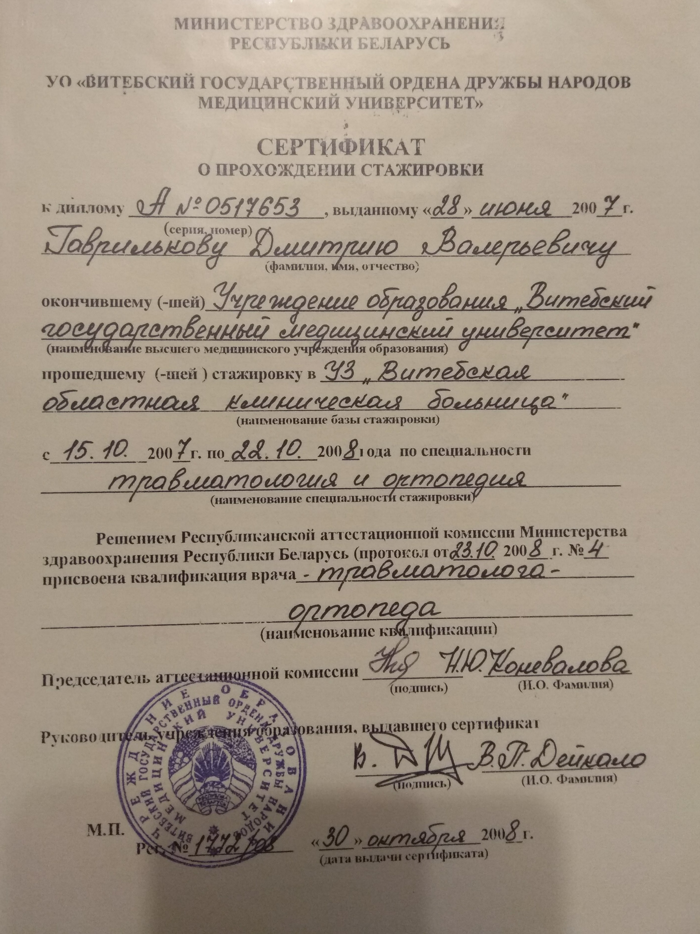 В 2001 году поступил в Витебский Государственный Медицинский Университет, который окончил в 2007 году, и поступил в клиническую ординатуру на кафедру травматологии ортопедии и военно полевой хирургии. Параллельно в 2008 году сдал экзамен о прохождении стажировки по травматологии и ортопедии. 2009 году перевелся для дальнейшего обучения в г. Минск, в Белорусскую Медицинскую Академию Последипломного Образования (БелМАПО) на кафедру травматологии и ортопедии.