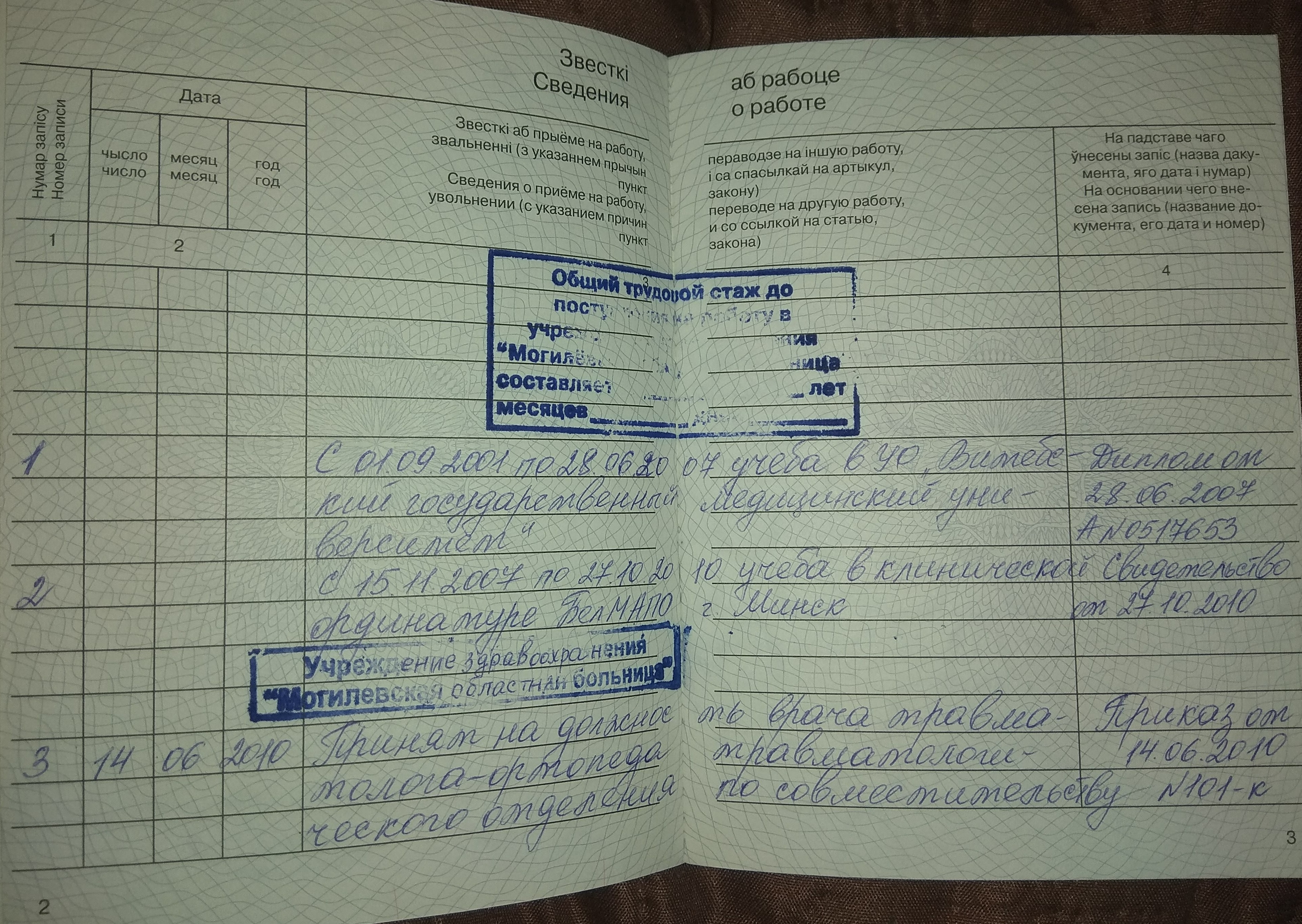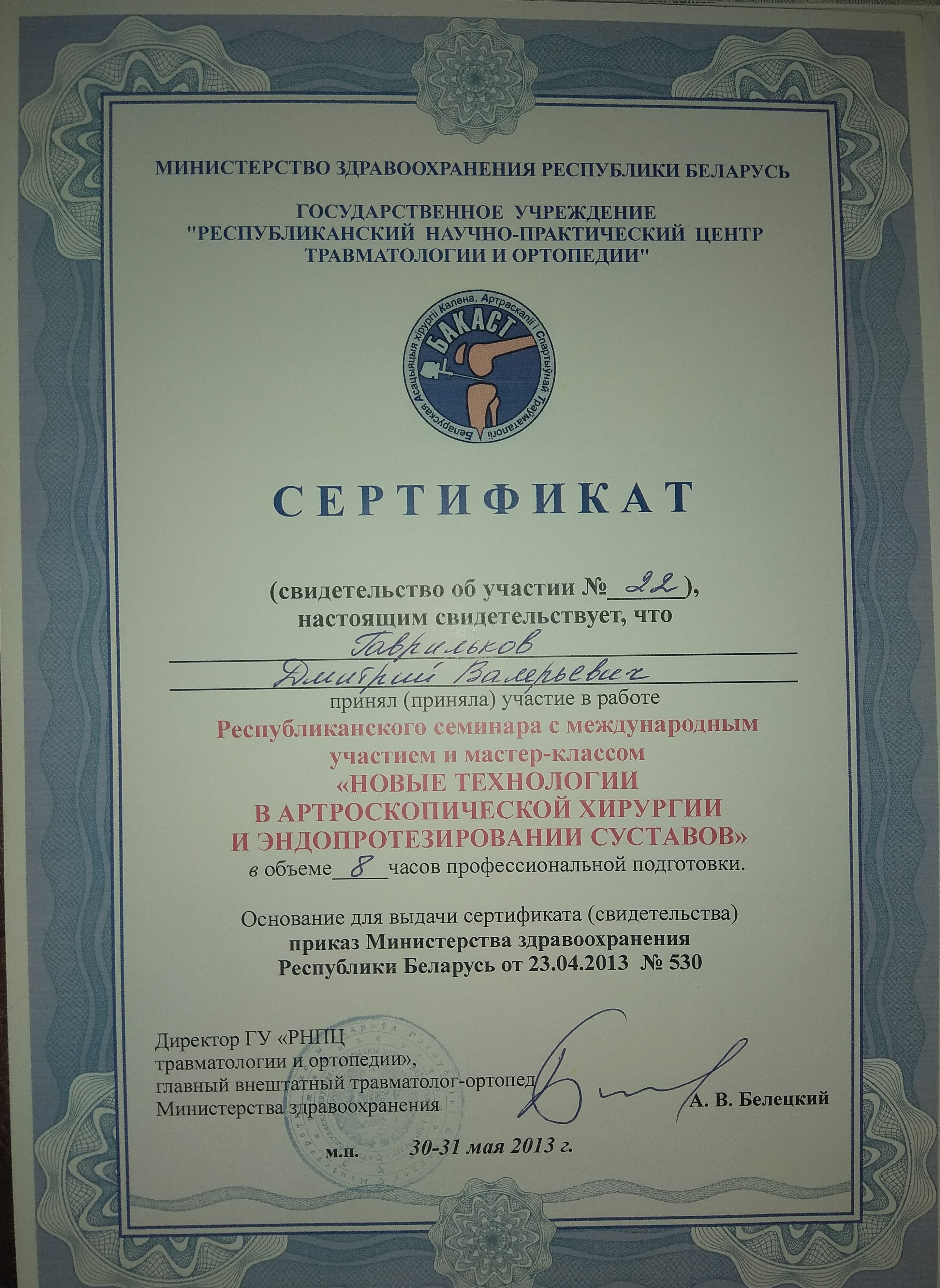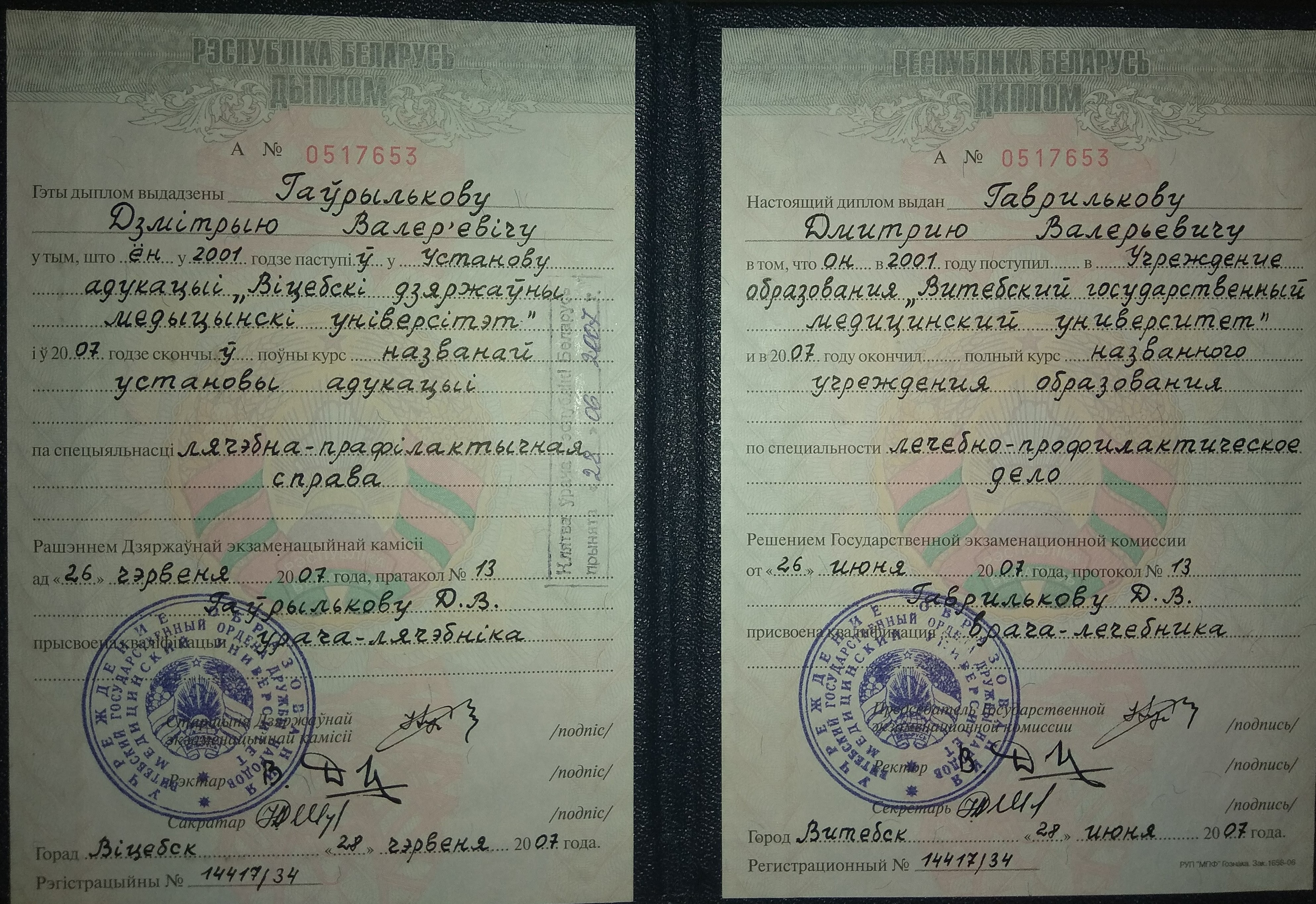 В 2001 году поступил в Витебский Государственный Медицинский Университет, который окончил в 2007 году, и поступил в клиническую ординатуру на кафедру травматологии ортопедии и военно полевой хирургии. Параллельно в 2008 году сдал экзамен о прохождении стажировки по травматологии и ортопедии. 2009 году перевелся для дальнейшего обучения в г. Минск, в Белорусскую Медицинскую Академию Последипломного Образования (БелМАПО) на кафедру травматологии и ортопедии.